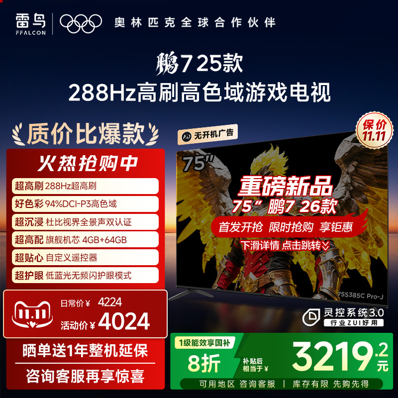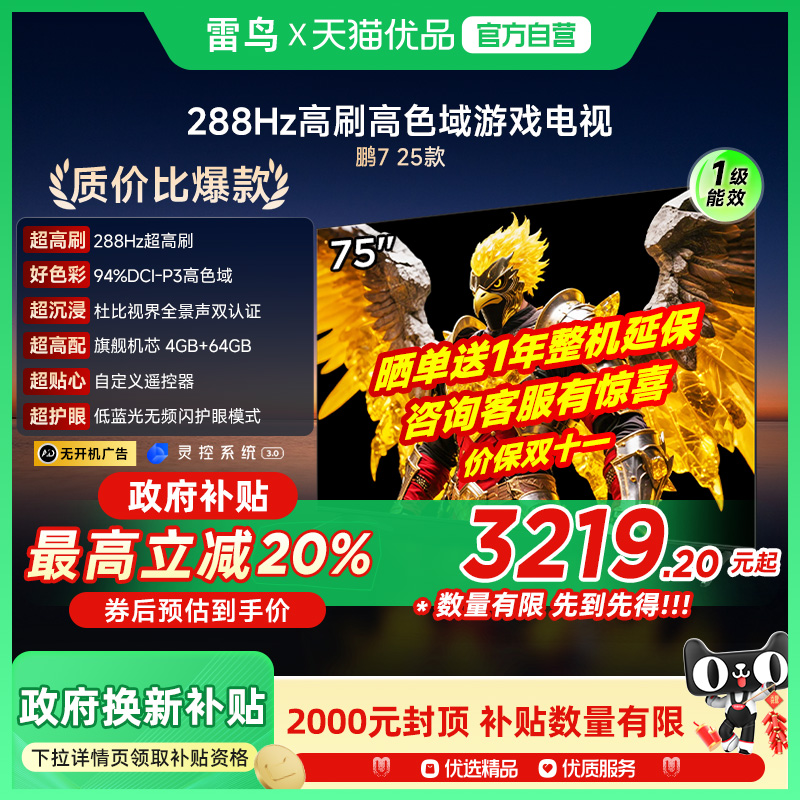 雷鸟鹏7 25款75英寸288Hz高刷满血HDMI2.1电视补贴